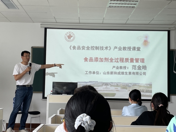 瑞福油脂股份有限公司董事长崔瑞福和山东新和成维生素有限公司副总经理范金皓作为羞羞漫画 *羞羞漫画 产业教授,分别带领学生观摩其企业具体生产工艺,并以实际生产过程为例,为学生讲授食品加工过程中的安全控制技术。