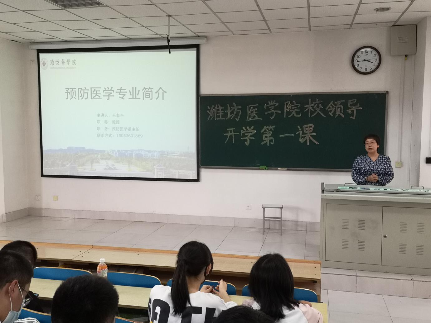 张建华通过图文并茂的方式展示了我国科学抗疫、共克时艰、以生命至上的伟大壮举取得的伟大成就,并对比了中西方在应对新冠肺炎疫情中的措施和效果,彰显了社会主义制度优势和中国共产党的领导、以人民为中心、集中力量办大事的政治优势。进而引入了预防医学专业在此次抗击新冠疫情的斗争中所发挥的至关重要的作用,极大增强了学生们的专业自豪感和专业认同感。“圣人不治已病治未病,不治已乱治未乱”,预防作为最经济、最有效的健康策略,受到党和国家的高度重视。张建华通过学科建设、人才培养体系并结合优秀学子成才经历,鼓励大家认真学好专业本领,不断提升自身综合素质,实现全面发展、成长成才,为我国医疗卫生事业发展做出贡献。预防医学专业负责人王春平教授从预防医学专业的基本情况、人才培养方案、课程设置、就业等方面进行专业教育,辅导员老师从疫情防控、日常管理等方面做了要求与安排。