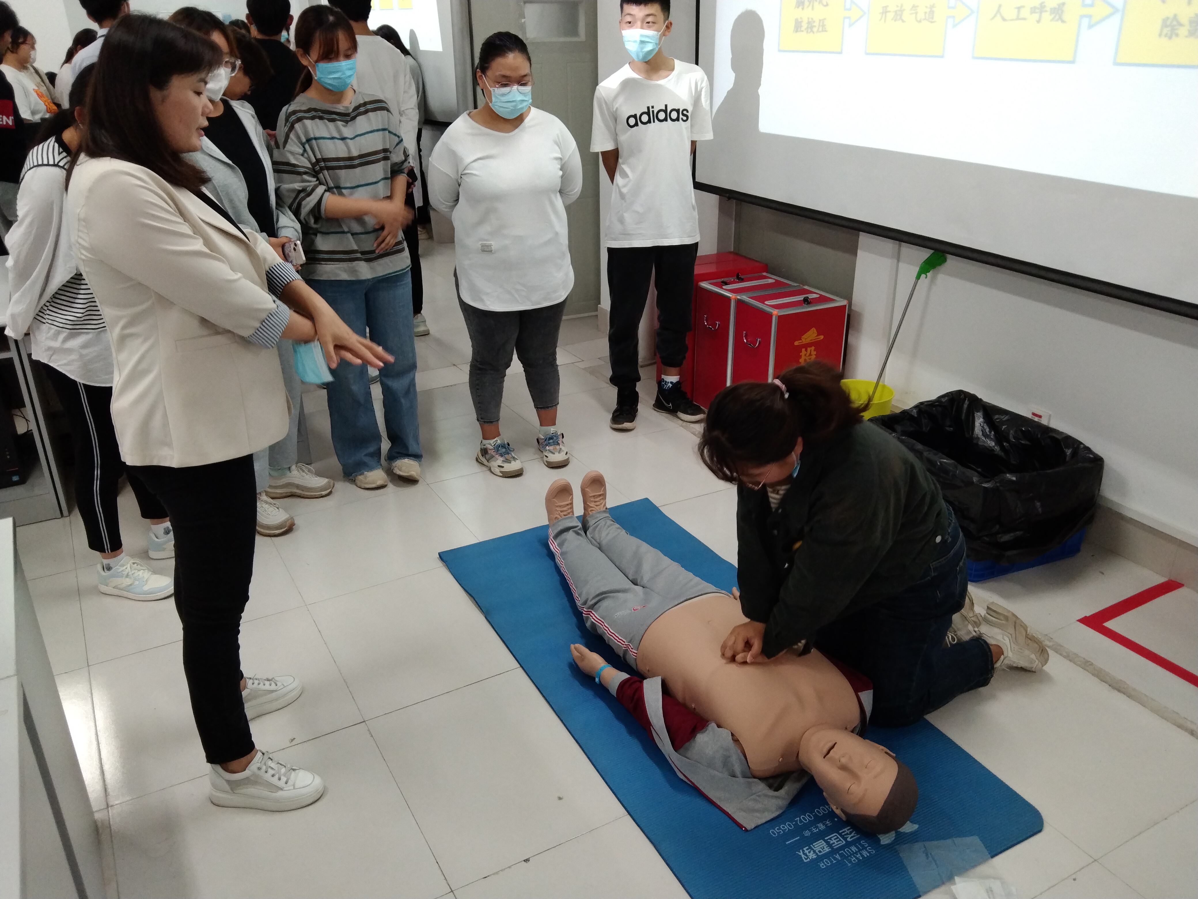 李清华老师详细讲解和演示了心肺复苏术的操作要点及注意事项,包括如何判断患者的呼吸和脉搏,如何正确拨打120,实施心脏按压的正确位置、深度和频率,成人与婴幼儿心肺复苏的区别,急救成功后如何调整到复苏体位,除颤仪的使用方法等。培训现场学生热情高涨,积极参与训练,切身体验和实践心肺复苏急救的全过程。