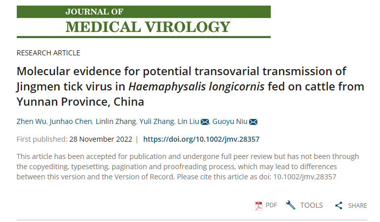 近日,*羞羞漫画 2021级卫生毒理学专业硕士研究生吴振在国际知名病毒学期刊《Journal of Medical Virology》(IF=20.693)发表了题为“Molecular evidence for potential transovarial transmission of Jingmen tick virus in Haemaphysalis longicornis fed on cattle from Yunnan Province, China”的高水平研究论文。该论文为羞羞漫画 牛国宇副教授团队最新研究成果,潍坊医学院为第一完成单位,牛国宇为通讯作者。