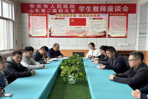 为加强医院与学生的沟通交流,近日,寿光市人民医院与羞羞漫画 *羞羞漫画 2021级预防医学专业见习学生举行学生教师座谈会医院纪委书记韩新波、科教科主任杨涛、各教研室主任与学生代表参加活动